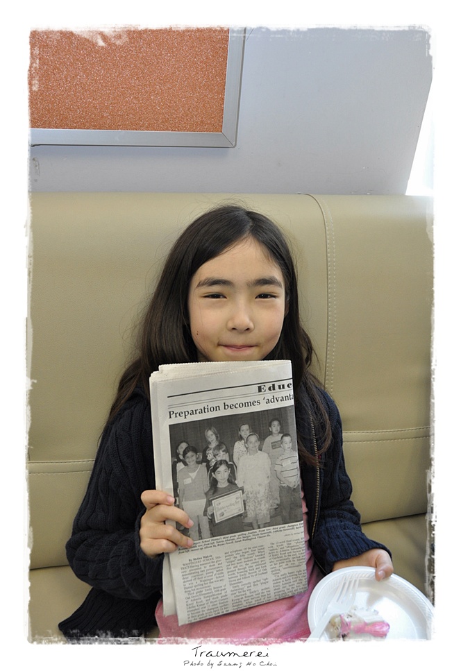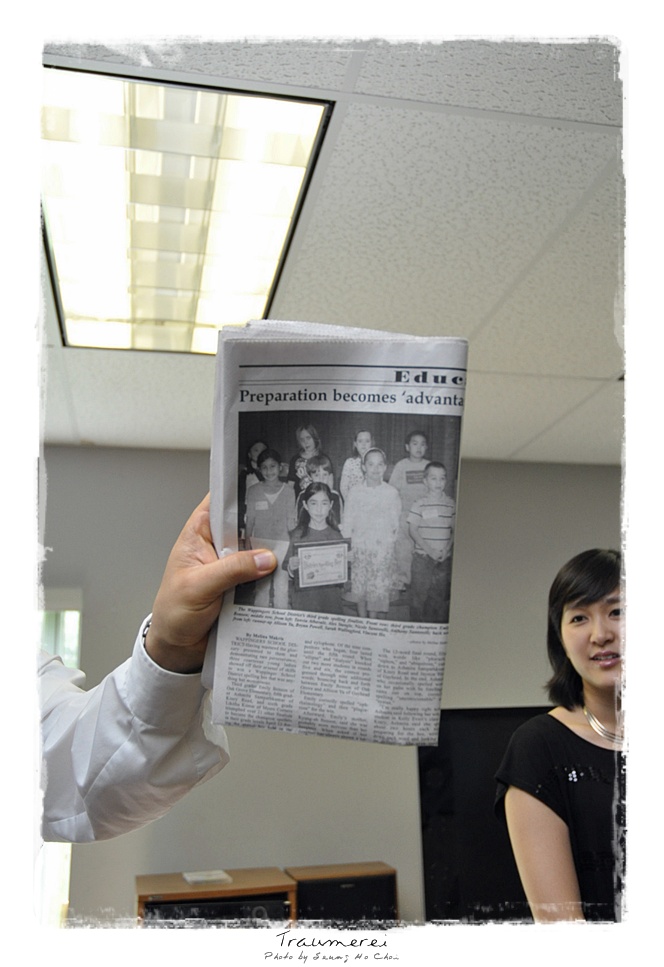 Emily 의 스펠링 비 경연대회 우승 했다는 신문에난 기사를 들고